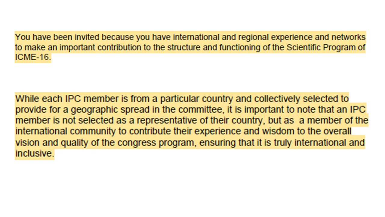 IPC members are invited based on their expertise, international experience, and networks, which will play a key role in building the structure and quality of the ICME-16 program. While representing diverse regions, IPC members serve not as national delegates but as contributors to the global mathematics education community. Their collective vision will ensure that ICME-16 continues the tradition of being truly international, innovative, and inclusive.